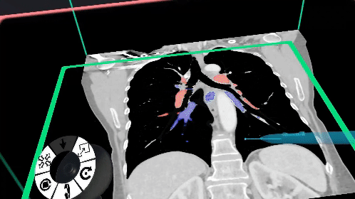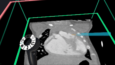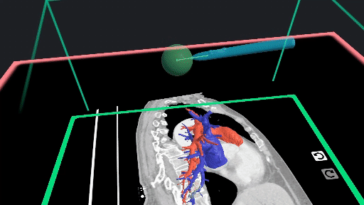 Elucis makes use of the interaction with a hard writing surface like a desk for actions that are performed on image cross section planes like the one seen above. With no widely available mixed reality styluses at hand in the last several years, we’ve still made use of the concept of a stylus in Elucis, except this time only the virtual version. We accomplished this by overlaying virtual styluses on mixed reality controllers in such a way that they could be comfortably used by resting the controller on a flat writing surface.